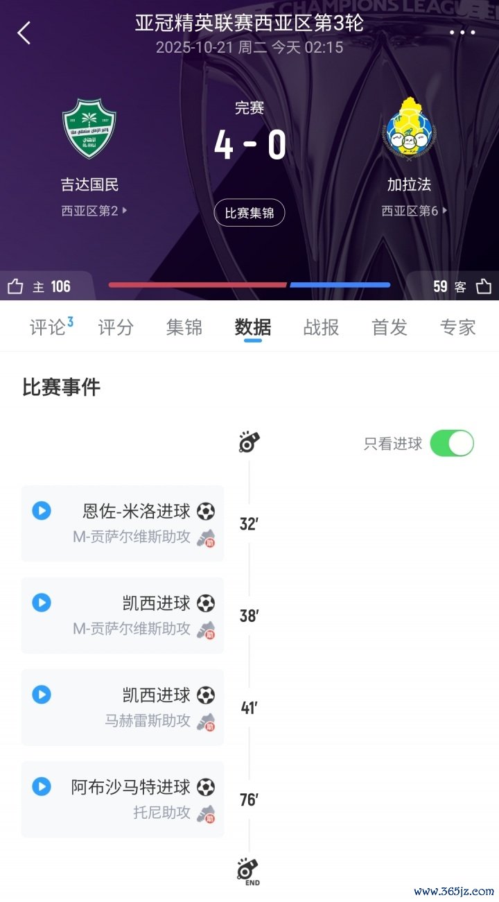 10月21日讯 亚冠精英联赛西亚区第3轮,吉达国民4-0大捷加拉法,本场比赛由马宁领衔的中国裁判组功令。
