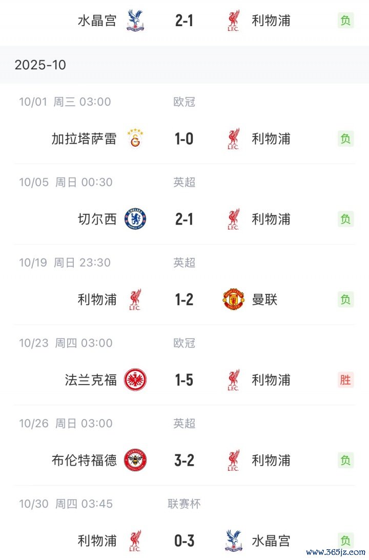 利物浦各赛事两连败,近7场1胜6负,他们下场将于11月2号迎战维拉。