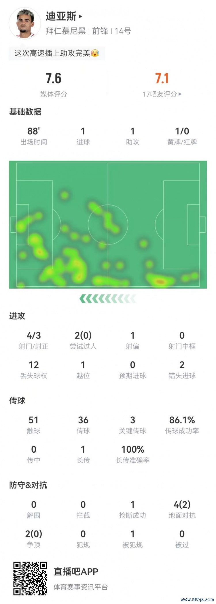 10月30日讯 拜仁在本轮德国杯4-1逆转科隆,迪亚斯本场数据如下: