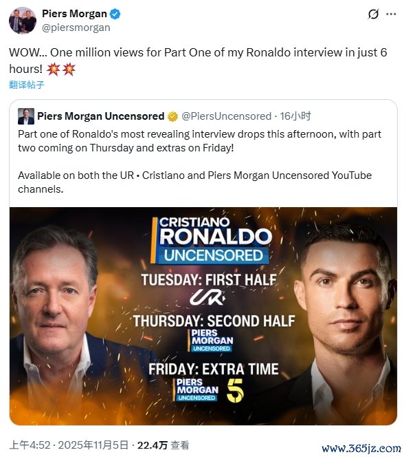 今晨摩根发文:“哇……我的C罗采访视频第一部分,短短6小时就卤莽了100万点击量! 💥💥”