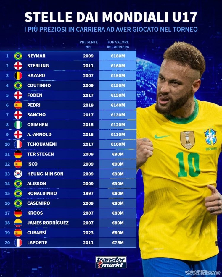 11月15日讯 德转列出了曾进入U17寰宇杯球员最高身价排行,内马尔1.8亿欧居首,斯特林1.6亿欧次席。