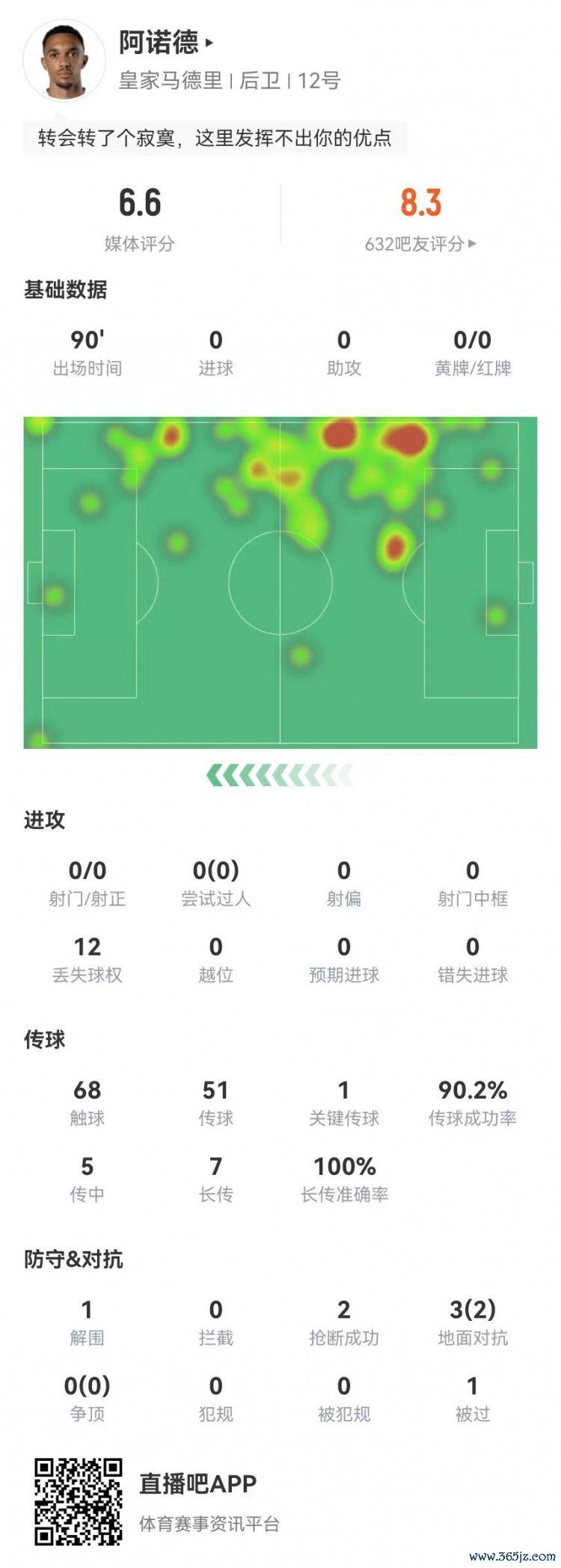 11月27日讯 皇马在本轮欧冠4-3险胜奥林匹亚科斯,阿诺德本场数据如下: