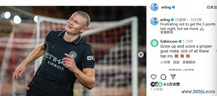 10月3日讯 在曼城客场2-2战平摩纳哥的欧冠比赛后,本场比赛打进两球的哈兰德更新了我方的社媒