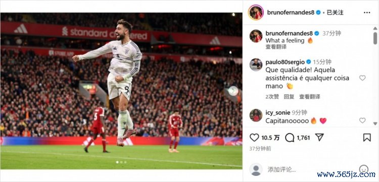 10月20日讯 本轮英超焦点战,曼联2-1客得胜物浦。赛后,曼联队长B费更新社媒庆祝得胜。