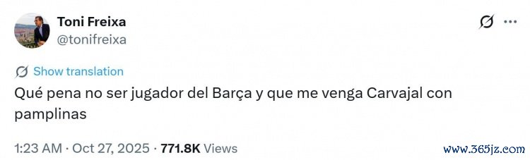 10月27日讯 当地本领10月26日,本赛季西甲第10轮国度德比,巴萨客场1-2负于皇马,前巴萨主席候选东谈主弗雷克萨(Toni Freixa)赛后更新社媒,月旦皇马球员卡瓦哈尔枯竭体育精神。