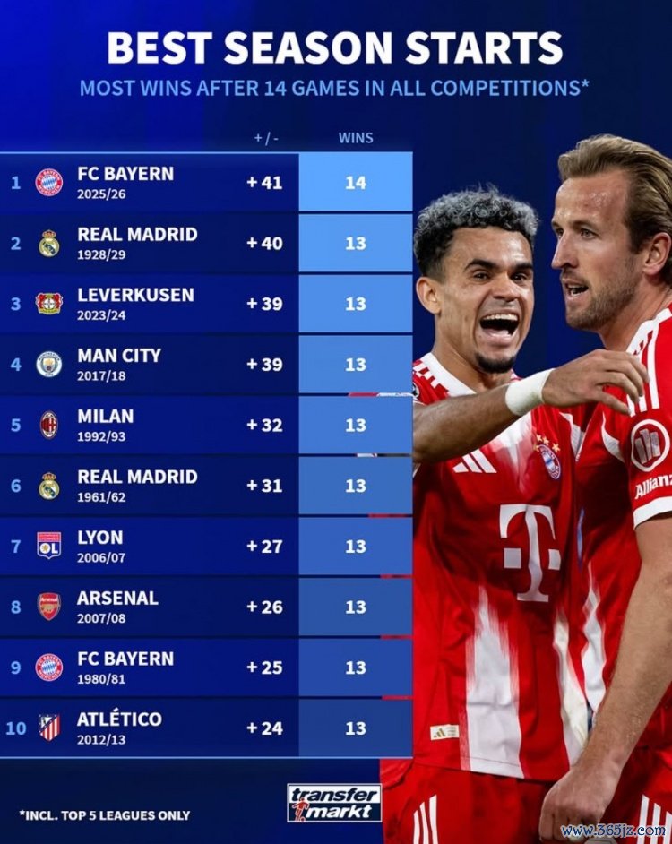 10月31日讯 拜仁在昨晚德国杯4-1逆转科隆,赛季开局各项赛事14场全胜抑止五大联赛球队历史记载,《转会商场》也统计了五大联赛球队历史单赛季各项赛事先14场的胜场情况。