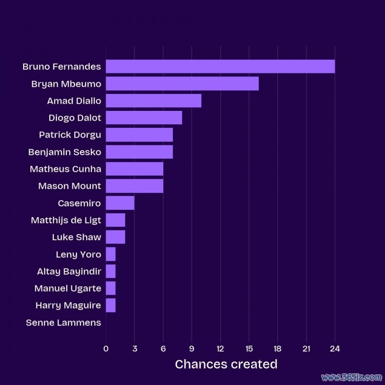 10月31日讯 数据机构squakwa统计了本赛季曼联队内英超创造契机情况,B费仍独自领跑。