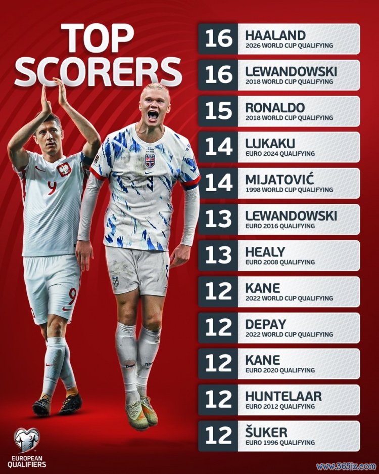 11月18日讯 欧足联男足国度队官方社媒账号列单届(世初赛欧洲区/欧洲杯预选赛)进球榜,本届世初赛的哈兰德以及2018世初赛的莱万以16球比肩第一。