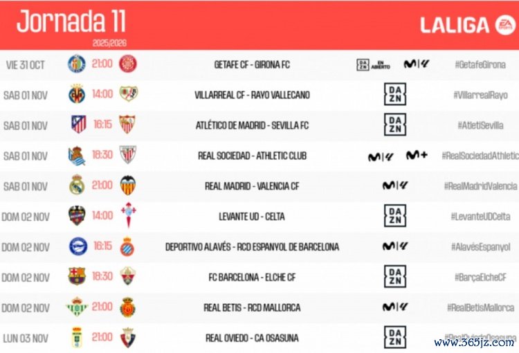 10月1日讯 今天,西甲联赛在官网公布了第11轮赛程,皇马和巴萨分袂在主场对阵瓦伦西亚和埃尔切。