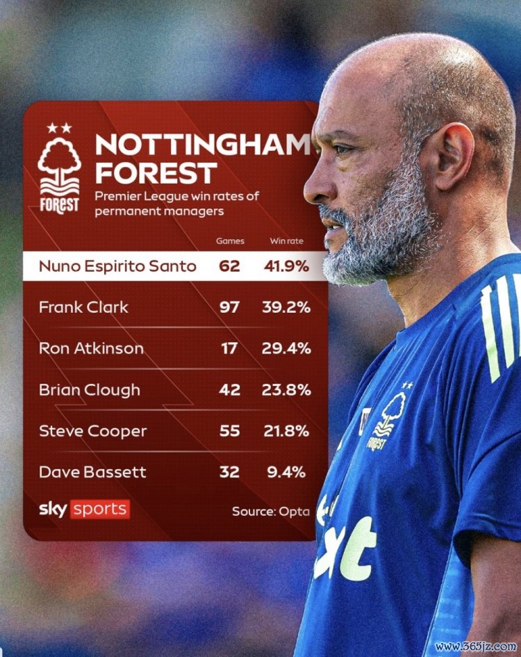 把柄数据统计,努诺是丛林队史英超胜率最高的主帅。努诺率队出战62场英超比赛,胜率达到了41.9%。上赛季努诺率队拿下英超第7,赢得欧联杯阅历。
