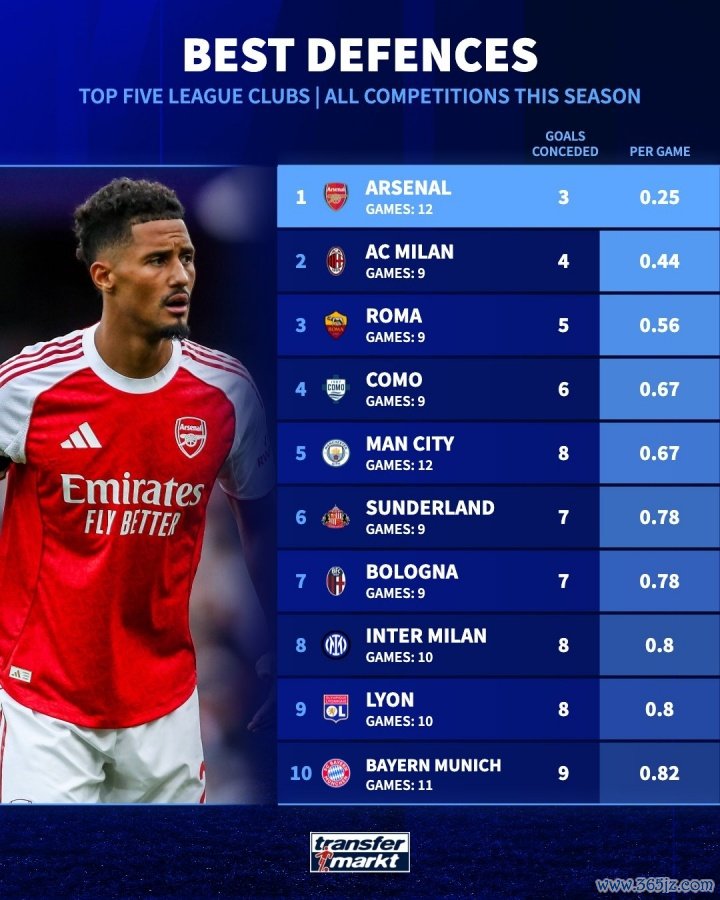 10月22日讯 凌晨欧冠比赛阿森纳4-0完胜马竞,赛后德转官方统计本赛季五大联赛球队丢球最少榜,阿森纳12场仅丢3球排行榜单第一。以下是把柄场均丢球数的排行↓