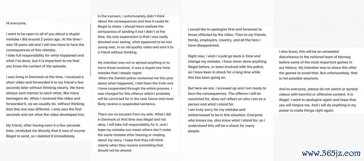 我也深知,这将在挪威国度队迎来史上最进击赛事之际,形成无谓要的烦闷。我本谋略在赛事落幕后公布此事以幸免影响,可惜已无法完结。