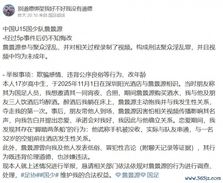 本东谈主17岁高中生,于2025年11月1日在深圳阳光旅社与詹景源雄厚。那时一又友称其为国足东谈主员,我念念邀请其一同宵夜、合照,时间詹景源购买酒水,我与他及一又友三东谈主饮酒后均醉酒。醉酒后我躺在床上,詹景源主动抱我并与我发素性关系,夺走我的第一次。过后,一又友带他东谈主到场,詹景源因窄小关系视频传播影响其名声,向我广告并提议恋爱,喜悦会对我好,我因此与他建立关系。恋爱时间,我发现其存在“脚踏两条船”的活动:他谎称手机被充公,实质与队友阿谀,与又名32岁的空姐赶赴旅社发素性关系。