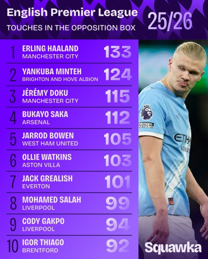 直播吧1月10日讯数据机构squawka统计了本赛季英超在对方禁区内触球情况,哈兰德领跑。