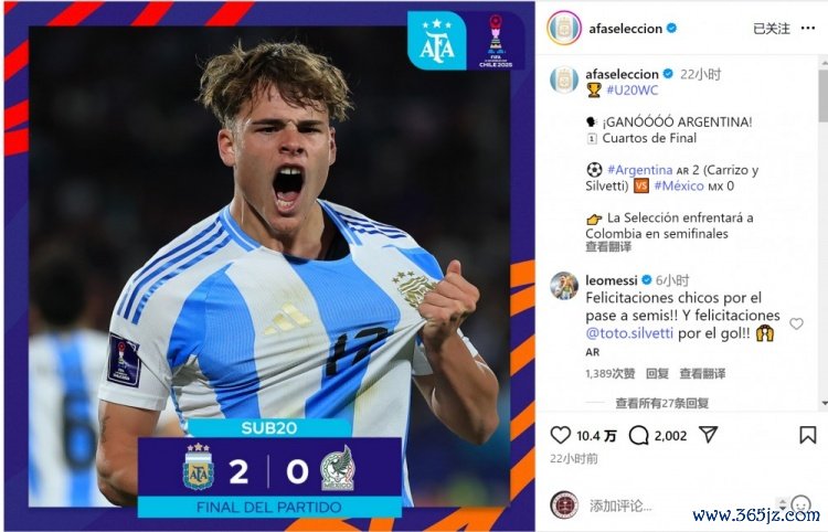 阿根廷队社媒晒出海报庆祝晋级,梅西留言:“祝愿小伙子们晋级半决赛,也恭喜西尔维蒂斩获进球!”