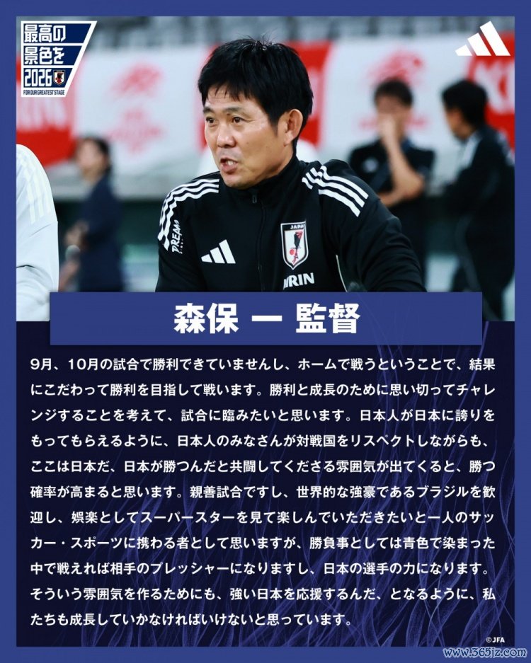 “固然仅仅一场国外友谊赛,但敌手巴西队是天下顶级球队。咱们迎接他们的到来,不外比赛事关输赢,若是咱们的主场被蓝色的海洋所遮蔽,那也会给敌手带来压力,同期成为日本队的助力。但愿球迷们概况营造起氛围,为日本队提供强有劲的撑抓,这也和咱们的成长痛痒相干。”