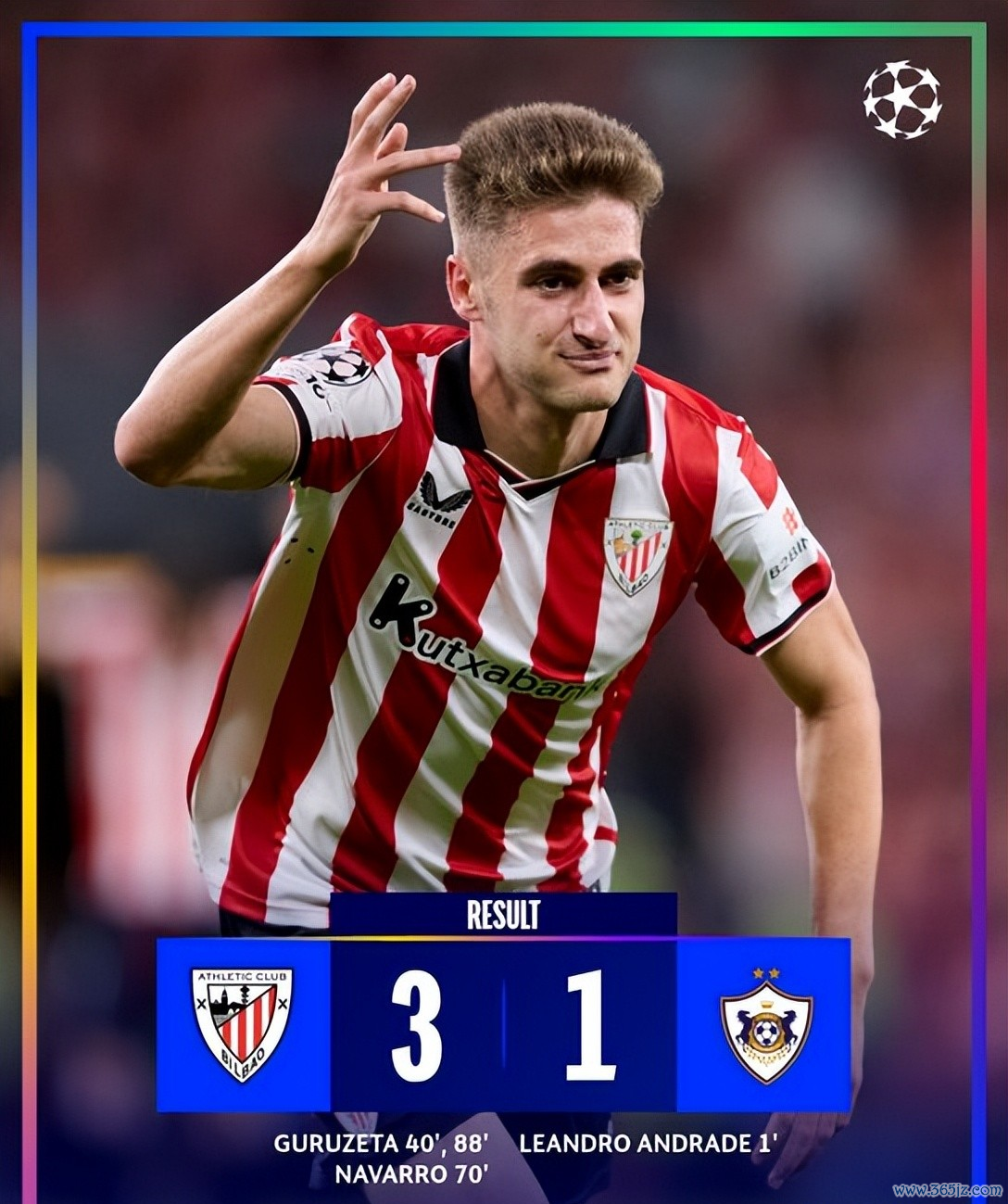 尽管安德拉德开场1分钟就匡助客队先下一城,但毕尔巴鄂在之后的比赛凭借古鲁泽塔的梅开二度和纳瓦罗的进球,最终在主场以3-1的比分逆转卡拉巴赫拿到了本场比赛的收效。