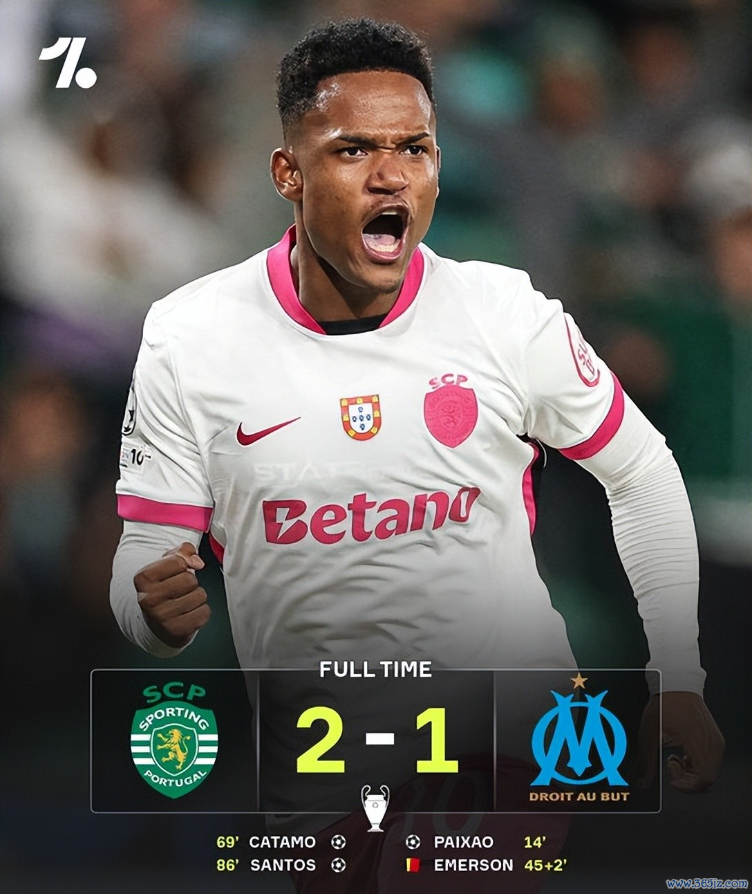凭借桑托斯在第86分钟的绝杀进球,葡体最终在主场2-1惊愕打败10东谈主迎战的马赛获取本场收效。