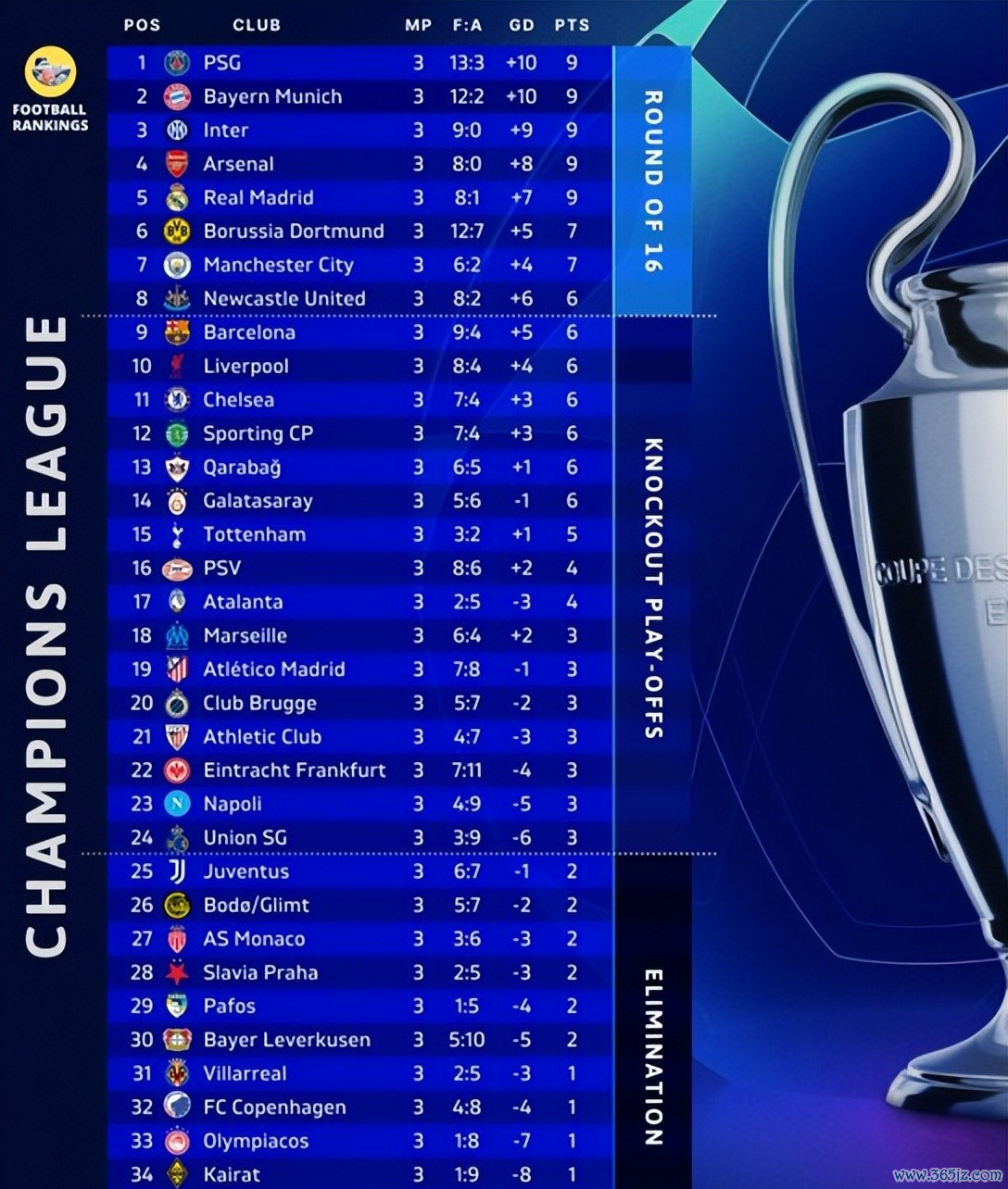 在当今的最新积分榜中,巴黎、拜仁、国米、阿森纳和皇马这5支3战全胜的球队,暂列积分榜的第1-5名。而多特,曼城和纽卡则暂列第6-8位。