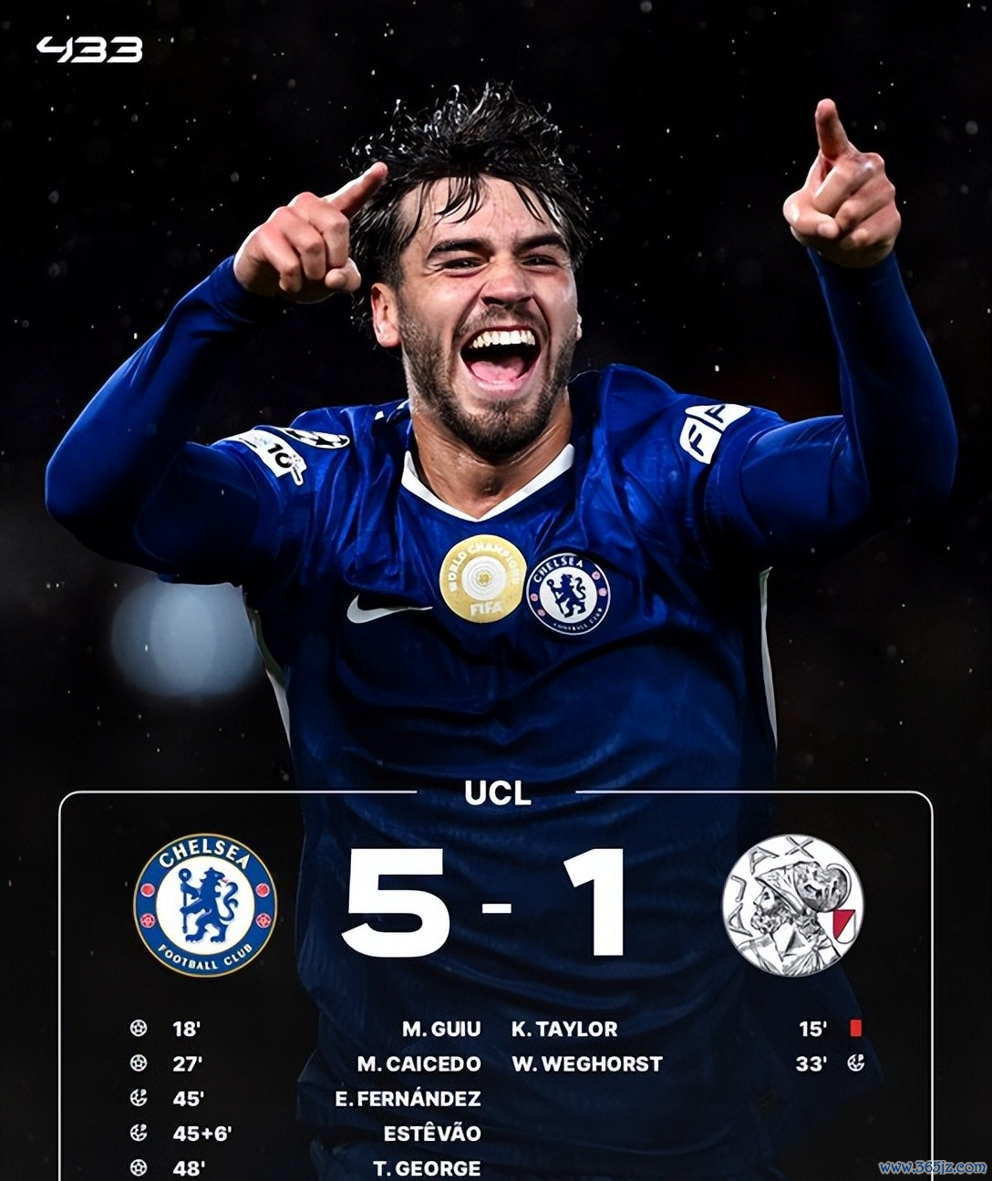 从吉乌,凯塞多、恩佐和埃斯特旺以及阿贾克斯在第33分钟由韦霍斯特的进球,两边其着实上半场就还是打出了4-1的比分。而到了下半场第48分钟乔治的进球,切尔西最终在主场5-1轻取阿贾克斯拿到了最终收效。