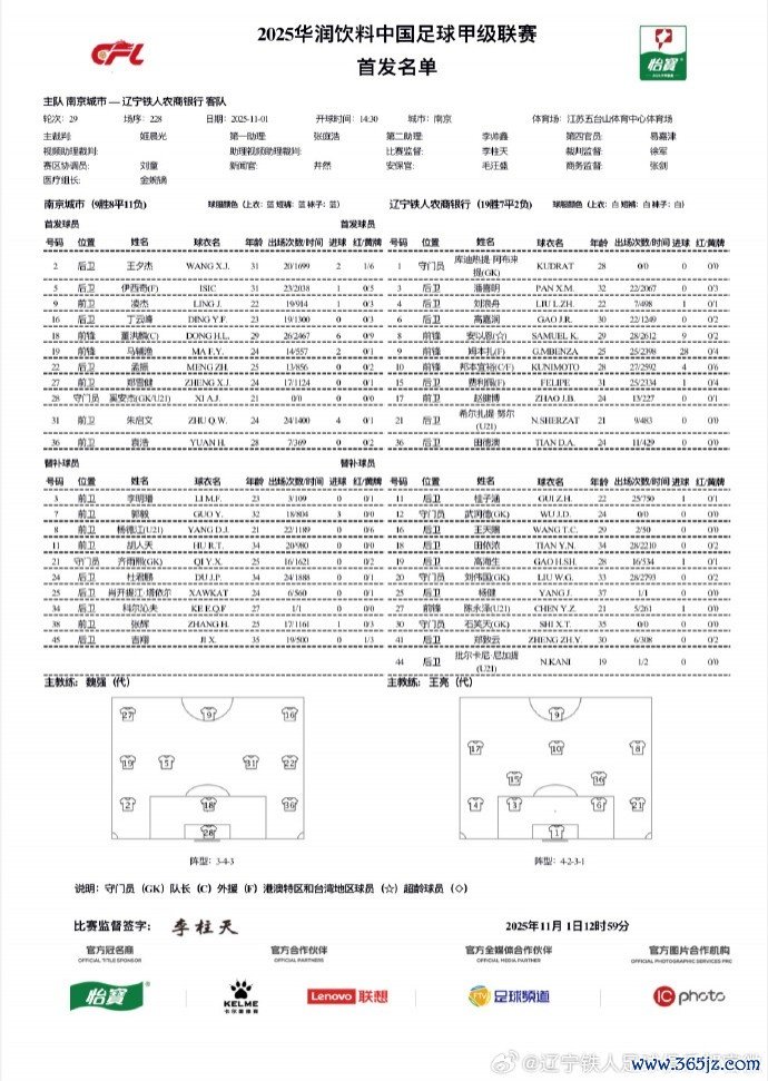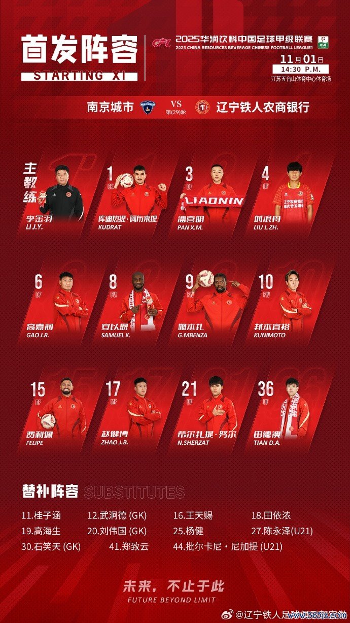 中甲第29轮,南京城市vs辽宁铁东谈主首发名单!