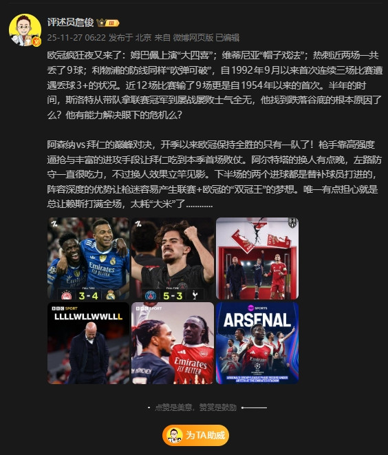 直播吧11月27日讯欧冠第5轮比赛战罢,阿森纳5战全胜排行榜首,利物浦惨败埃因霍温,驳倒员詹俊先生在社媒作念出点评。