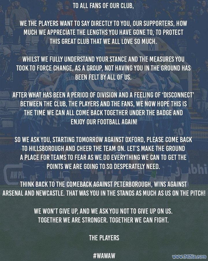 是以咱们肯求你们,从翌日对阵牛津联的比赛开动,请回到希尔斯堡球场为球队加油恭维。让咱们把这座球场形成客队颤抖的处所,因为咱们将竭尽所能去争取咱们如斯紧要需要的积分。