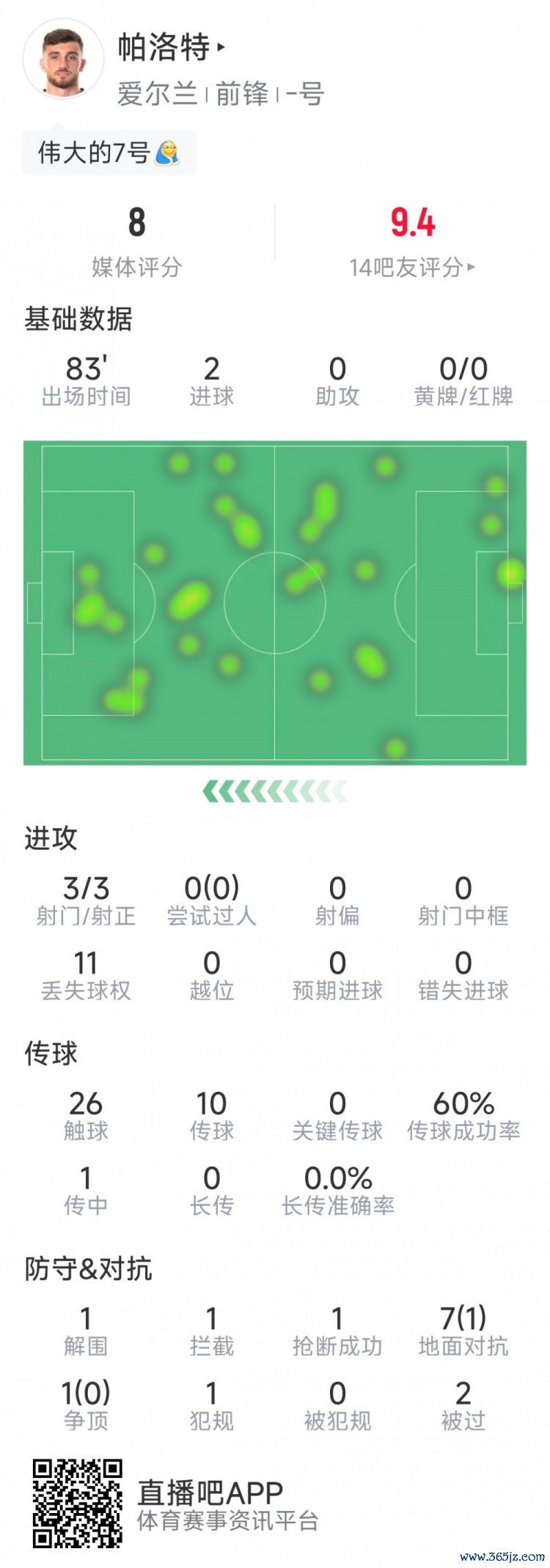 据统计,帕洛特荟萃两场代表爱尔兰梅开二度,是球队历史第四位作念到这小数的球员,此前三位是邓恩(1936年)、基恩(2013年)、罗宾逊(2021年)。