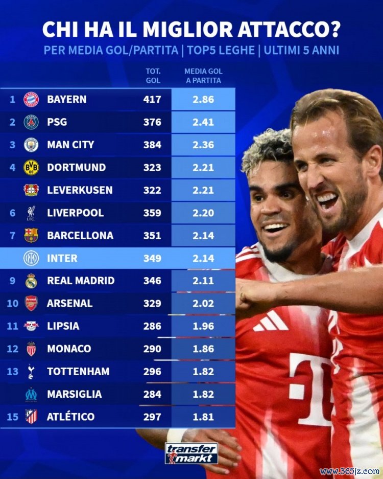 11月20日讯 德国转会市集统计了近5年球队在五大联赛中的场均进球数目,比肩出榜单,拜仁2.86球居首,巴黎、曼城二三位。