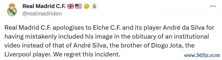 皇家马德里足球俱乐部就机构缅念念视频中误将埃尔切足球俱乐部球员安德烈·达·席尔瓦的画面纳入(该画面本应为利物浦球员迪奥戈·若塔的伯仲安德烈·席尔瓦),向埃尔切俱乐部及安德烈·达·席尔瓦本东谈主致歉。咱们对此事深表歉意。