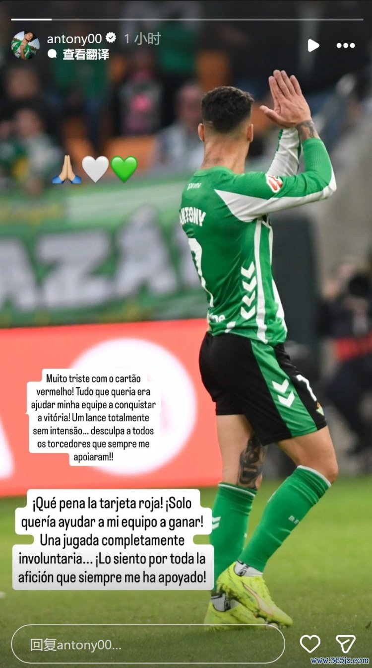 安东尼在酬酢媒体上写谈:“很缺憾吃到红牌,我仅仅思帮球队赢球,十足是意外的当作…… 很对不起让一直撑抓我的球迷们失望了。”